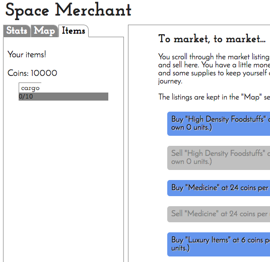 A choose-your-own-adventure science fiction game. Buy, sell, travel. This has a graph view of all possible events that was primarily for development purposes, but it’s so cool I left a button to show it off!